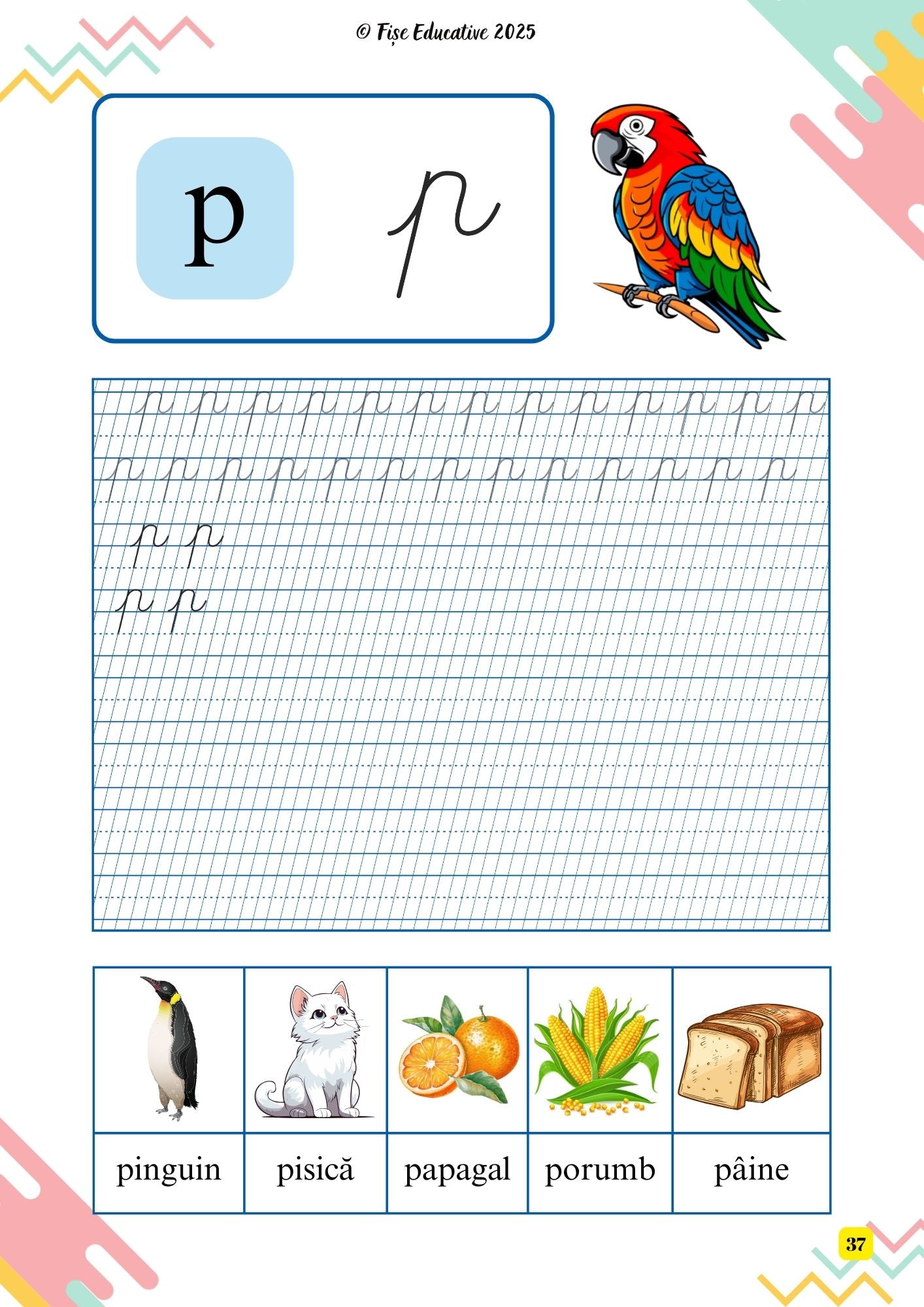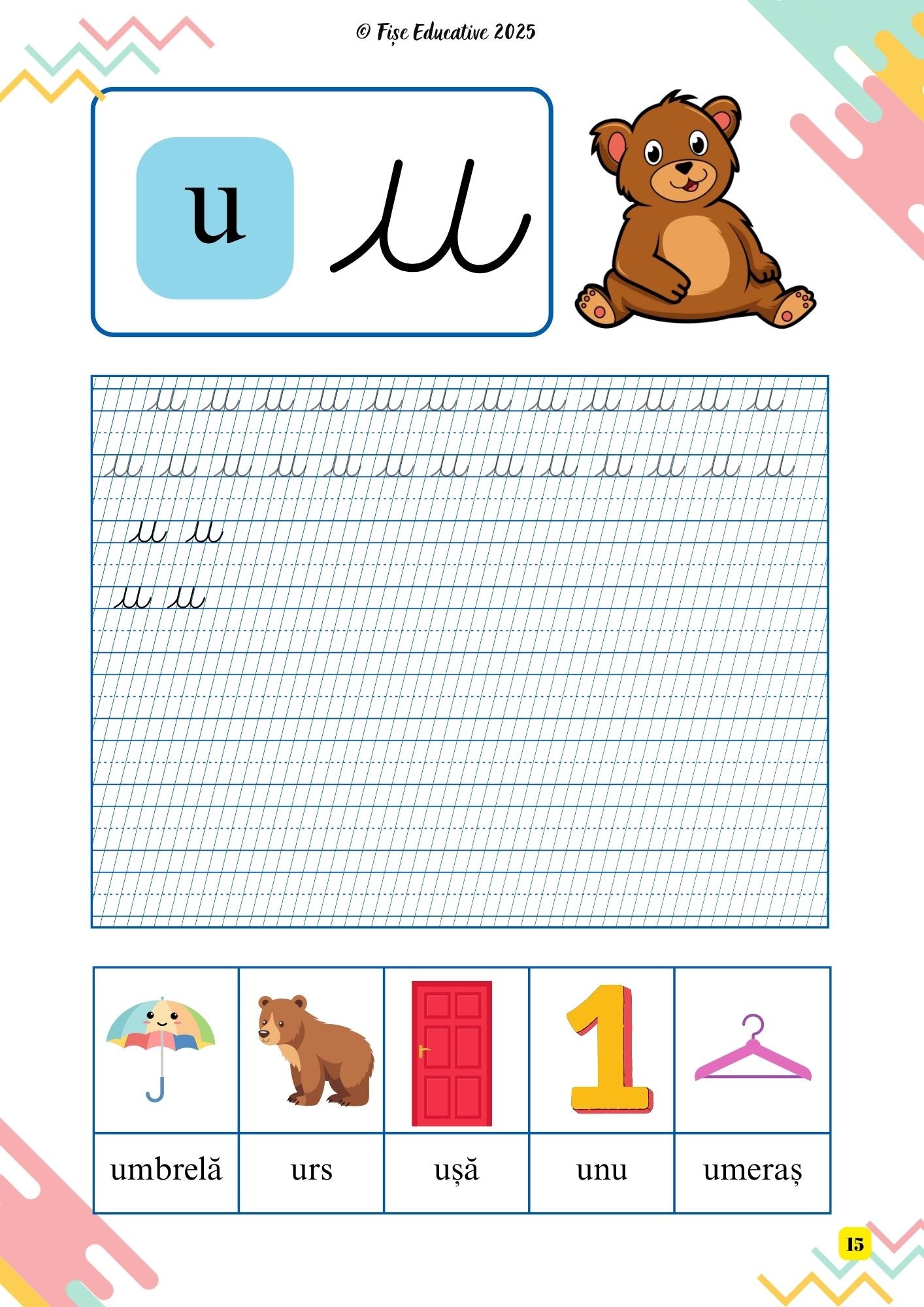 Spre deosebire de fișele generice descărcate de pe internet, acest set urmează ordinea naturală a achizițiilor grafomotorii: pregătire → literă → legătură. Nu forțează, nu grăbește și nu creează deprinderi greșite.