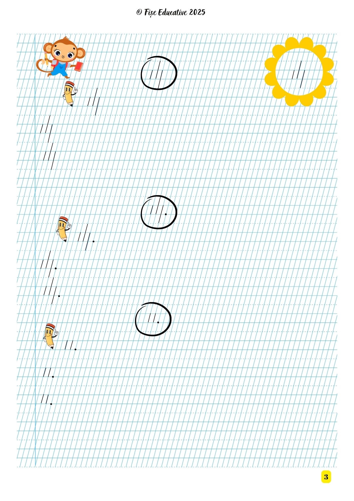 Micro-explicație pedagogică: în etapa inițială, copilul nu poate controla fin mișcarea. De aceea, exercițiile trebuie să fie scurte, repetitive și previzibile – întâi semne grafice, apoi litere, apoi legături. Această progresie stabilizează motricitatea fină și previne formarea unor deprinderi greșite.