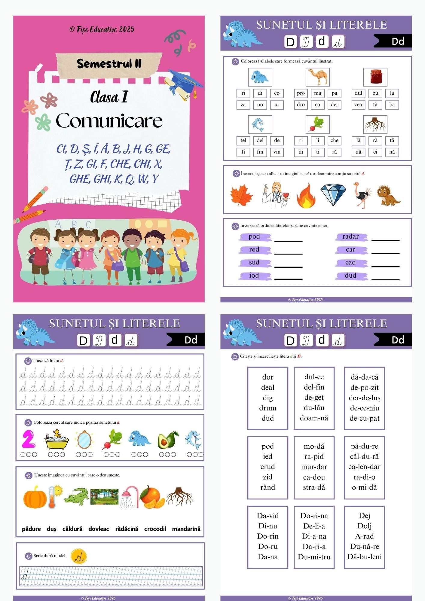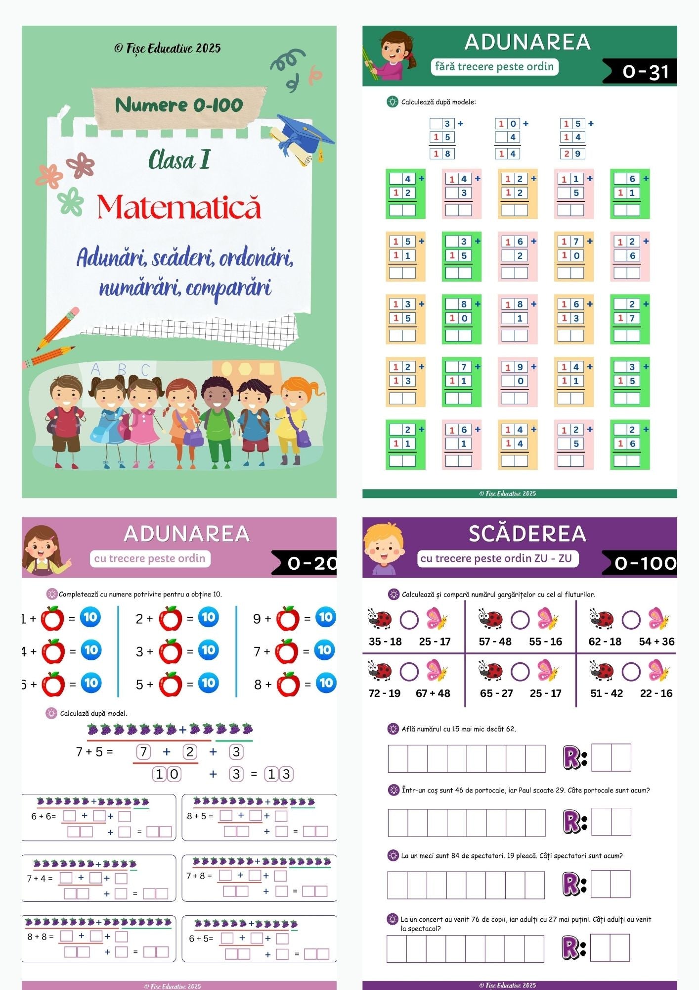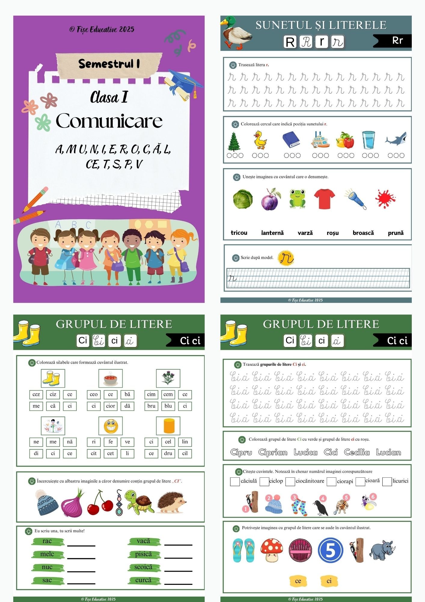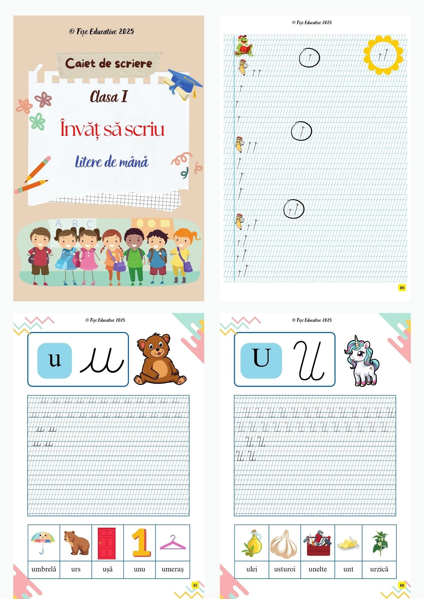 Un pachet educativ complet pentru clasa I, în format PDF, creat pentru dezvoltarea competențelor de bază: comunicare, scriere, calcul matematic și motricitate fină.